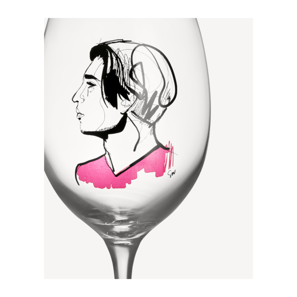 Det här vinglaset och de andra föremålen i serien All About You från Kosta Boda handlar om kärlek, längtan och passion – starka känslor fångade i glas med rena, mjuka linjer och målade motiv med influenser från modevärlden. Motivet här blandar kärlek med passion. Serien lanserades 2015. Design av Sara Woodrow.