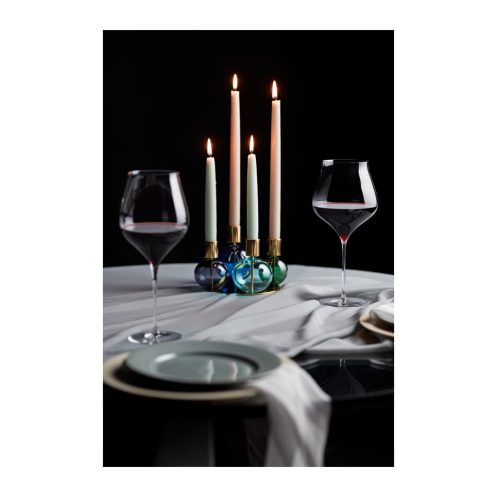 För att fira sitt 200-årsjubileum presenterar Holmegaard Bubbles en serie ljusstakar som sprudlar av uttrycksfullhet och mästerligt hantverk. Denna fyrarmade Holmegaard Bubble ljusstake är 14 cm hög och har fyra munblåsta bubblor i borosilikatglas i jadegrönt, rökgrått, safirblått och en djupare blå nyans. Med fyra ljus placerade i något varierande höjder, som tillsammans bildar en vackert komponerad kvadrat, lyfter denna ljusstake din passion för modern dansk glaskonst till nya höjder. Blir den hemmets nya lysande juvel? Föreställ dig hur mörkret faller utanför medan du tänder ljusen i Holmegaards nya serie av ljusstakar.