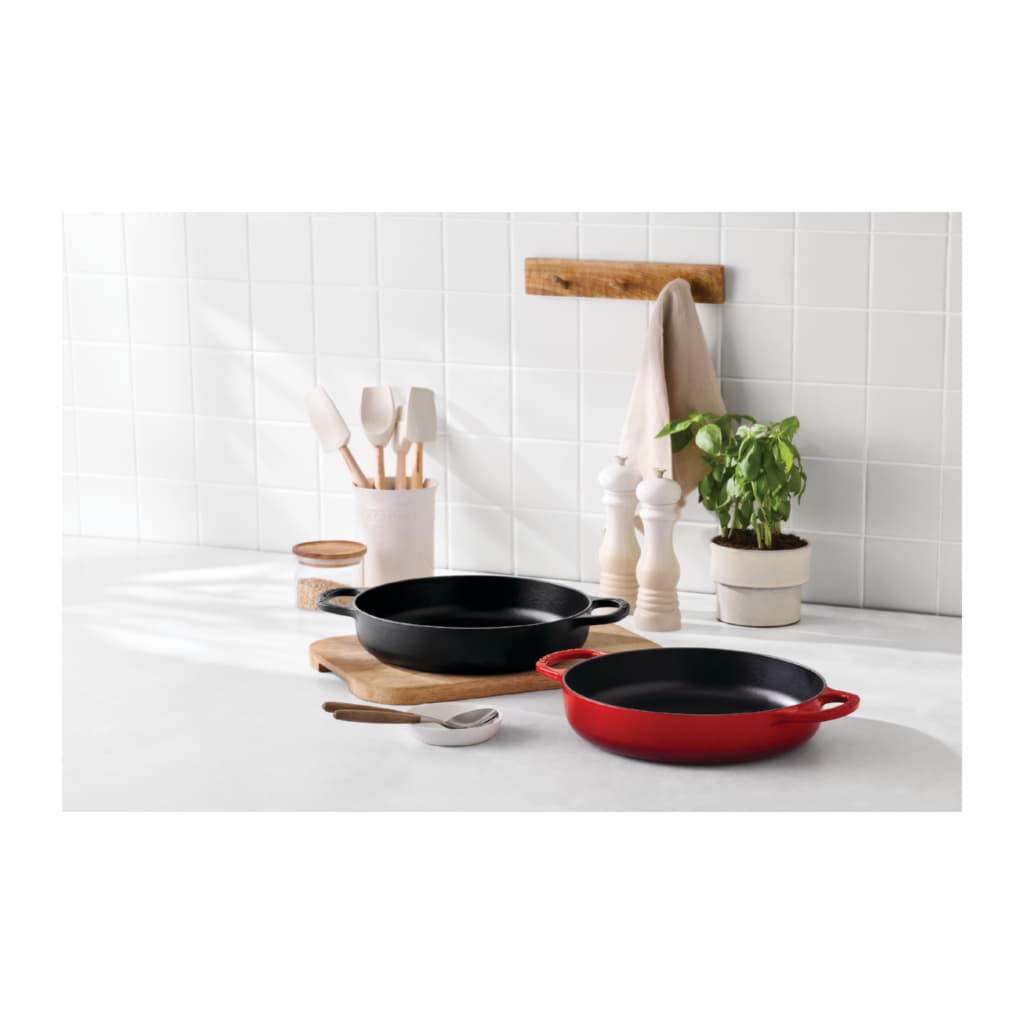 Le Creuset gjutjärnspanna är ett mångsidigt köksredskap. Dess design gör den idealisk för en rad rätter, inklusive stekning, grytor, såser och mycket mer. Med en perfekt diameter på 28 cm balanserar den mellan att vara kompakt nog för daglig användning och rymlig nog för att rymma generösa portioner.