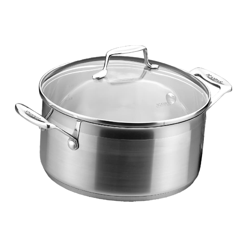 Gryta i Scanpans rostfria serie Impact. Alla kärl är utrustade med froppfri kant och måttskala. Ugnssäker upp till 260 grader.