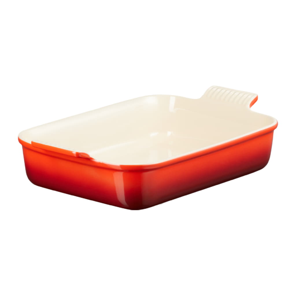 Den rektangulära ugnsformen i stengods från Heritage-serien är tillverkad i en autentisk Le Creuset-design. Heritage-serien är inspirerad av den ursprungliga och eleganta franska designen som presenterades av Le Creuset för första gången 1931, och avspeglar både designtraditionerna och Le Creusets hantverksmässiga arv. Ugnsformen tål både ugn, mikrovågsugn och frys. Den rektangulära ugnsformen har många användningsområden och är perfekt för t.ex. lasagne eller ugnsstekt kyckling. Det slitstarka stengodset har en invändig sandfärgad glasyr som gör att ugnsformen är lätt att diska och inte absorberar smak, fukt, lukt eller färg från livsmedel. Stengodsformen kan användas i temperaturer från -18 till +260 grader. Tål att diskas i diskmaskin.