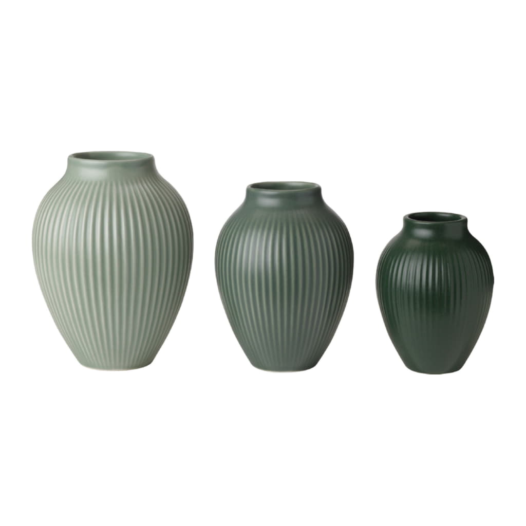Knabstrup set med 3st minivaser i färgerna; misty green, celadon green och dark green. Genom åren har Knabstrup Keramik tillverkat ett antal vackra vaser i olika formgivningar. Den här vasen formgavs ursprungligen i slutet av 1940-talet, och med sin eleganta och klassiska form är vasen ett tidlöst stycke keramik som håller stilen långt in i framtiden. Idag finns vasen i moderna, nordiska färgtoner som matchar vår enkla men trivsamma inredning. Knabstrup-vasen är designad så att den inte bara presenterar sig själv utan även årstidens blombuketter och grenar på vackraste sätt.