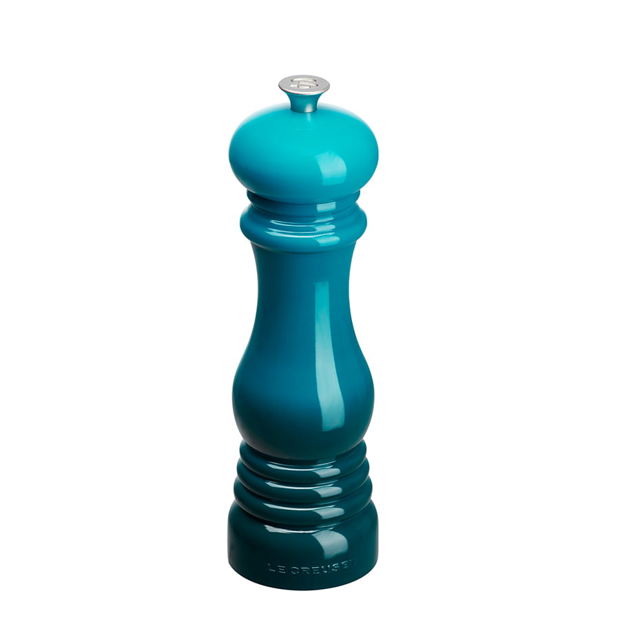 Den stilrena och effektiva saltkvarnen från Le Creuset är gjord i högblank akryl med en keramisk kvarn som finfördelar saltkristallerna effektivt. Det starka och lätta akrylmaterialet är resistent mot korrosion och garanterar lång livslängd. Knoppen är tillverkad av rostfritt stål och designad efter knoppen på Le Creusets ikoniska gjutjärnsgrytor. Genom att vrida på knoppen justerar man hur grovt kvarnen ska mala.